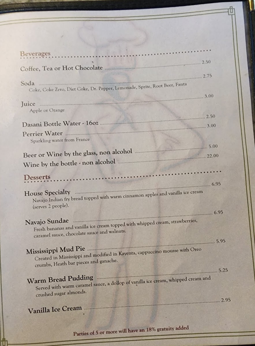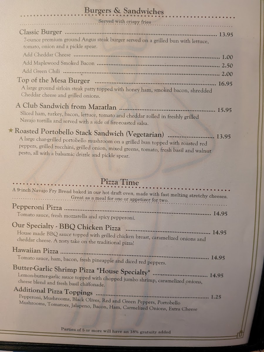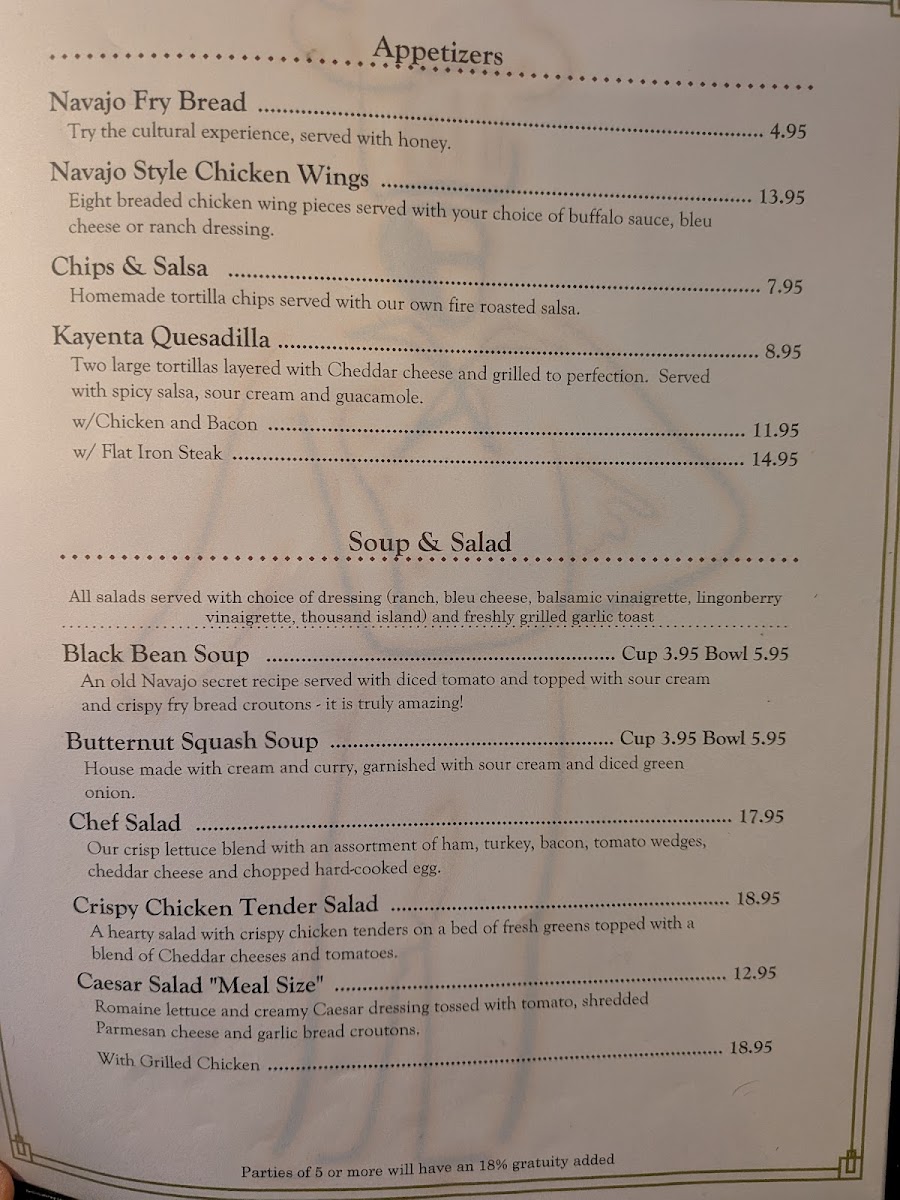 Guests can enjoy a variety of dishes that reflect the local flavors and cultural heritage, such as Navajo Fry Bread and Navajo Tacos, alongside comforting staples like Green Chili and Black Bean Soup. Lighter options like salads and sandwiches are available too, making it easy to find something that fits the moment, whether it’s a hearty meal or a shared snack with friends.